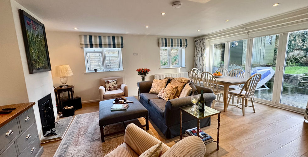 This lovely holiday home has two bedrooms upstairs (super king and twin room) leading to a sunny balcony and family bathroom. downstairs there is a large utility room with walk in shower and an open plan sitting room with wood burner, dining area and kitchen. Glass doors open on to the garden.